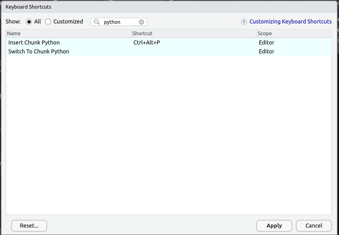 위 메뉴를 타고 들어간 다음, 필터에 python이라고 검색하면 Code chunk 넣는 기능이 있음. 이것을 필자는 Ctrl + Alt + p로 설정해놓음. 저장하고 나오면 Rmd 파일에서 파이썬 코드 청크를 키보드 쇼트커트으로 입력 가능함.