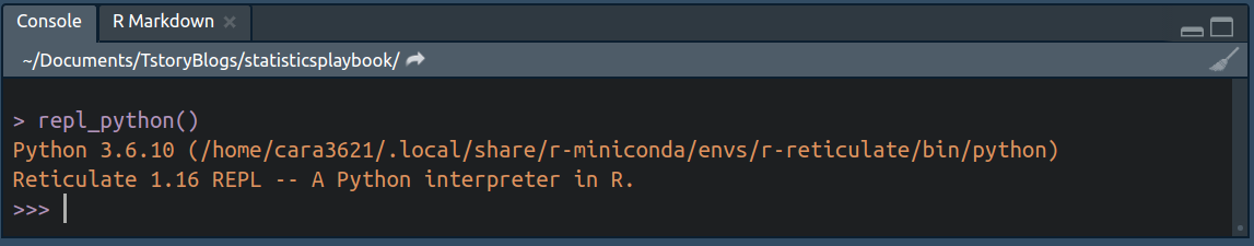 콘솔창에 repl_python()을 입력해준다. 그러면 콘솔 창이 파이썬 콘솔로 바뀜. >>>은 파이썬 콘솔을 의미한다. quit()를 써주면 다시 R콘솔인 >로 바뀌는 것을 볼 수 있다.
