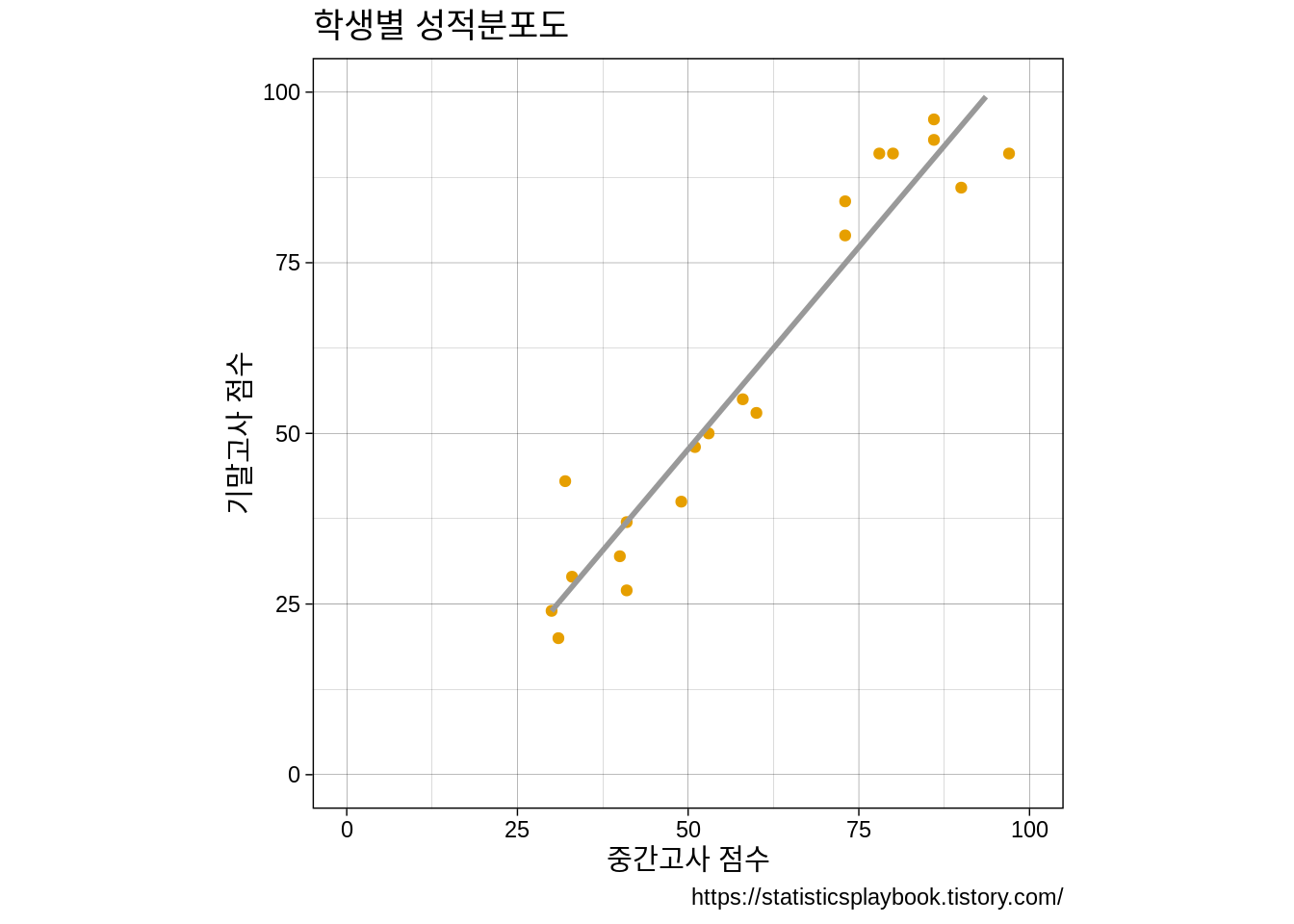 이번 포스트에서는 필자가 만들어놓은 가상 데이터를 간단히 설명하면 다음과 같다. 30명 학생들의 정보가 들어있는 데이터이고, id, 성별, 중간고사, 기말고사 성적이 들어있는 데이터이다. 필자의 R을 사용한 통계학이라는 수업에서 사용된 데이터이다. R과 통계학이 궁금하신 분들은 필자의 유튜브도 체크해보시길 바란다. 깨알 홍보. 오늘은 데이터 중에서 중간고사와 기말고사 정보만을 가지고 포스팅을 진행한다.