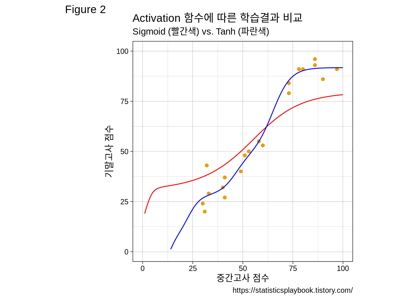 subtitle = "Sigmoid (빨간색) vs. Tanh (파란색)",