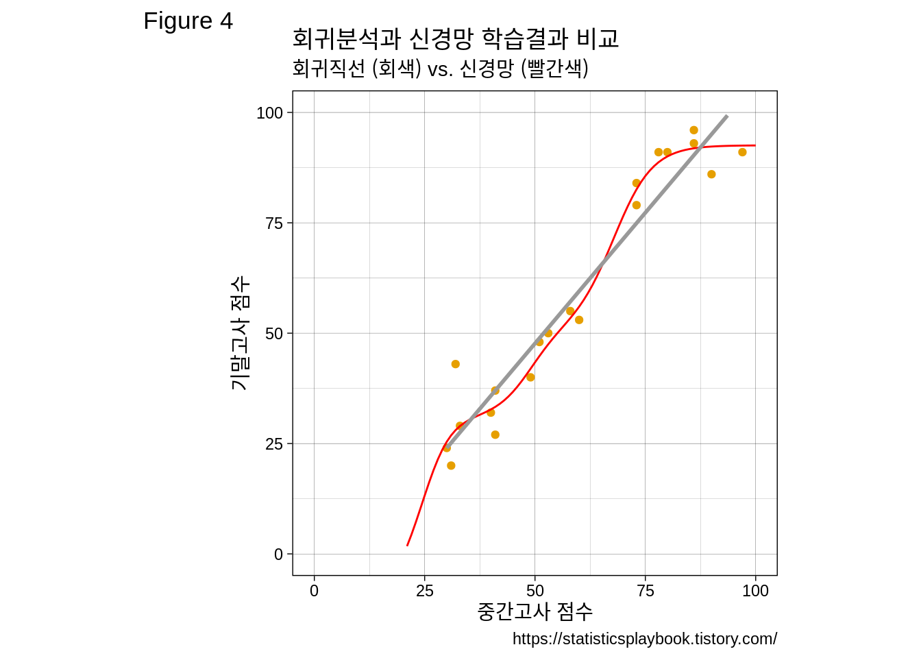 subtitle = "회귀직선 (회색) vs. 신경망 (빨간색)",