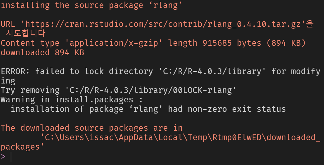 rlang 같은 패키지를 설치를 하거나, 특정 패키지 설치시 다른 연동 패키지들 업데이트를 하라고 하는데, 그 중 꼭 하나가 failed to lock directory라고 하면서 에러가 남.