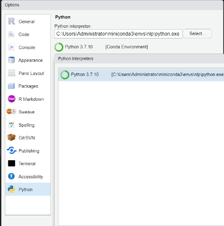 RStudio의 최신 버전(1.4 이상) 설치하면 Tools→Gloabl Options 메뉴에서 Python 메뉴가 생긴 것을 알 수 있습니다. 여기서 RStudio의 Python 가상 환경을 설정할 수 있습니다. 위 pickle 파일을 저장했을 때와 동일한 가상환경을 설정하십시오. 저는 Conda 환경을 활용했고, nlp라는 가상환경을 설정해두었습니다.