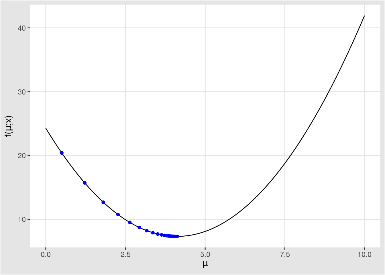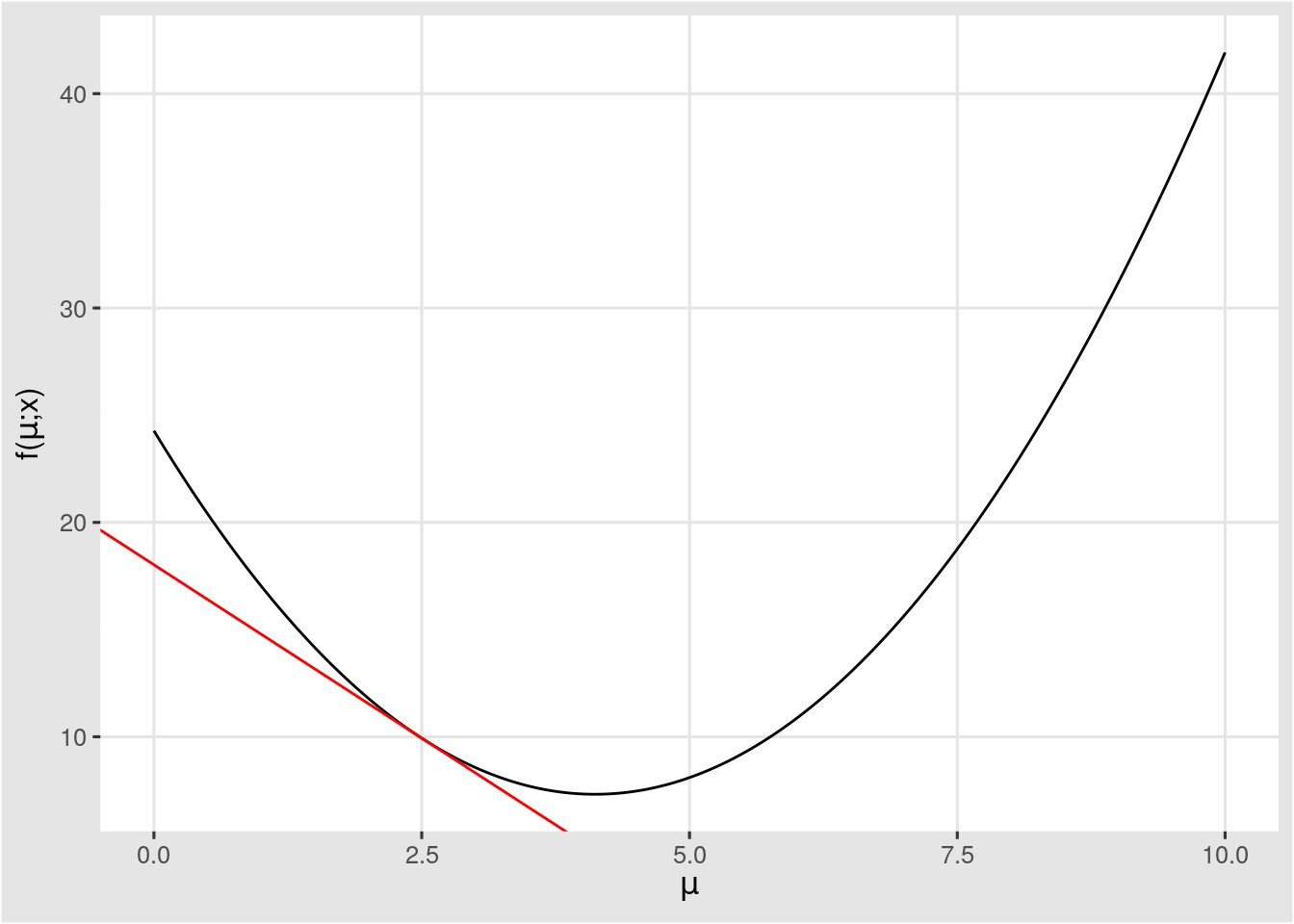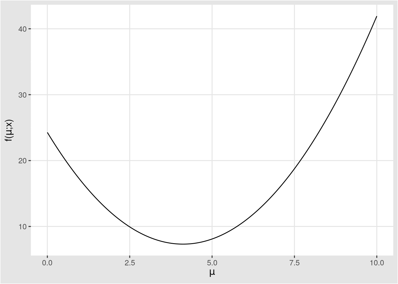 앞에서 살펴본 함수 \(f\)는 모수(\(\mu\))를 입력값으로 하는 함수이므로, 다음과 같이 함수를 정의 할 수 있다.