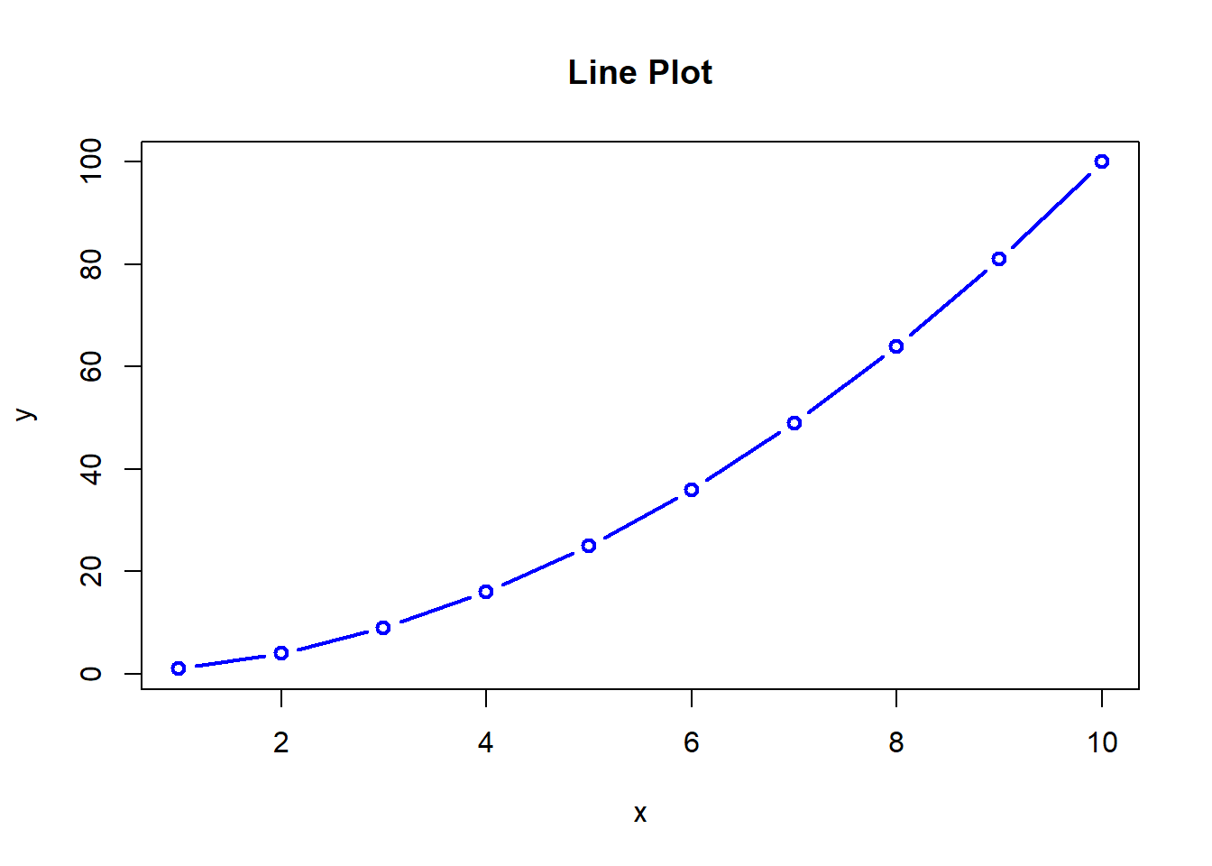 main: 플롯의 제목입니다.xlab: x축에 대한 레이블입니다.ylab: y축의 레이블입니다.col: 표시된 점 또는 선의 색상입니다.pch: 표시된 점에 사용할 기호입니다.lty: 표시된 선의 선 유형입니다.lwd: 표시된 선의 선폭입니다.xlim: x축의 범위입니다.ylim: y축의 범위입니다.log: 로그 축은 “x” 또는 “y”가 지정된 경우에 사용됩니다.axes: 논리적입니다. TRUE이면 축이 그려집니다.