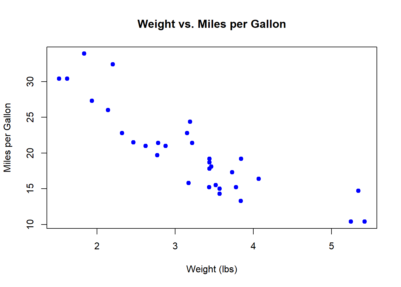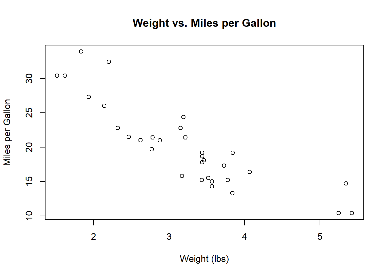 이제 데이터가 생겼으니 그래프를 만들 수 있습니다. 이 예제에서는 차량 중량(wt)과 갤런당 마일(mpg) 간의 관계를 보여주는 산점도를 생성합니다. 이를 위해 plot() 함수를 사용합니다: