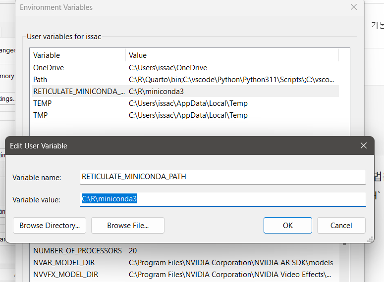 이것은 현재 설치되어있는 미니콘다의 설치 경로를 R에서 알아채지 못해서 발생하는 오류이다. 해결법은 R에서 미니콘다가 현재 어디에 설치되어 있는지 알려주면 된다. 환경변수 `RETICULATE_MINICONDA_PATH ` 를 만들어서 설치경로를 입력하면된다.