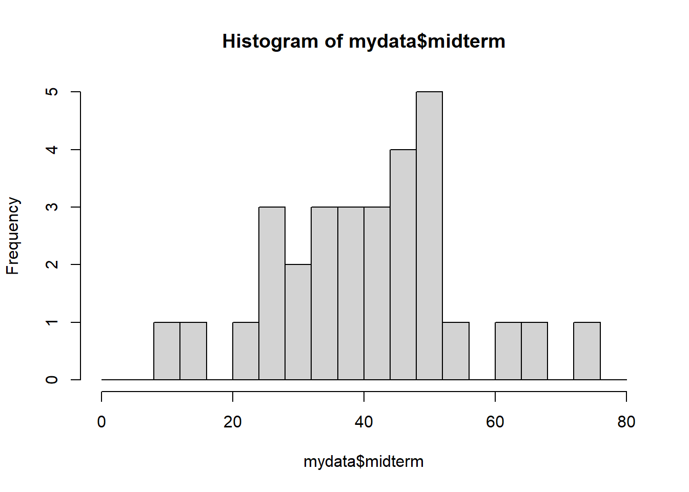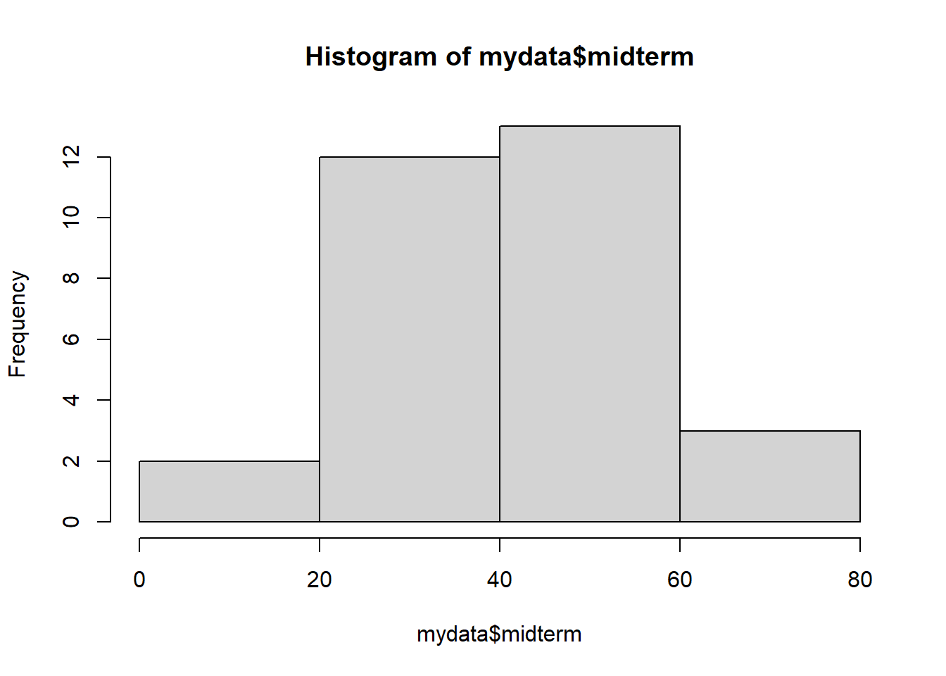 hist(mydata$midterm, breaks= c(0:4)*20) # or