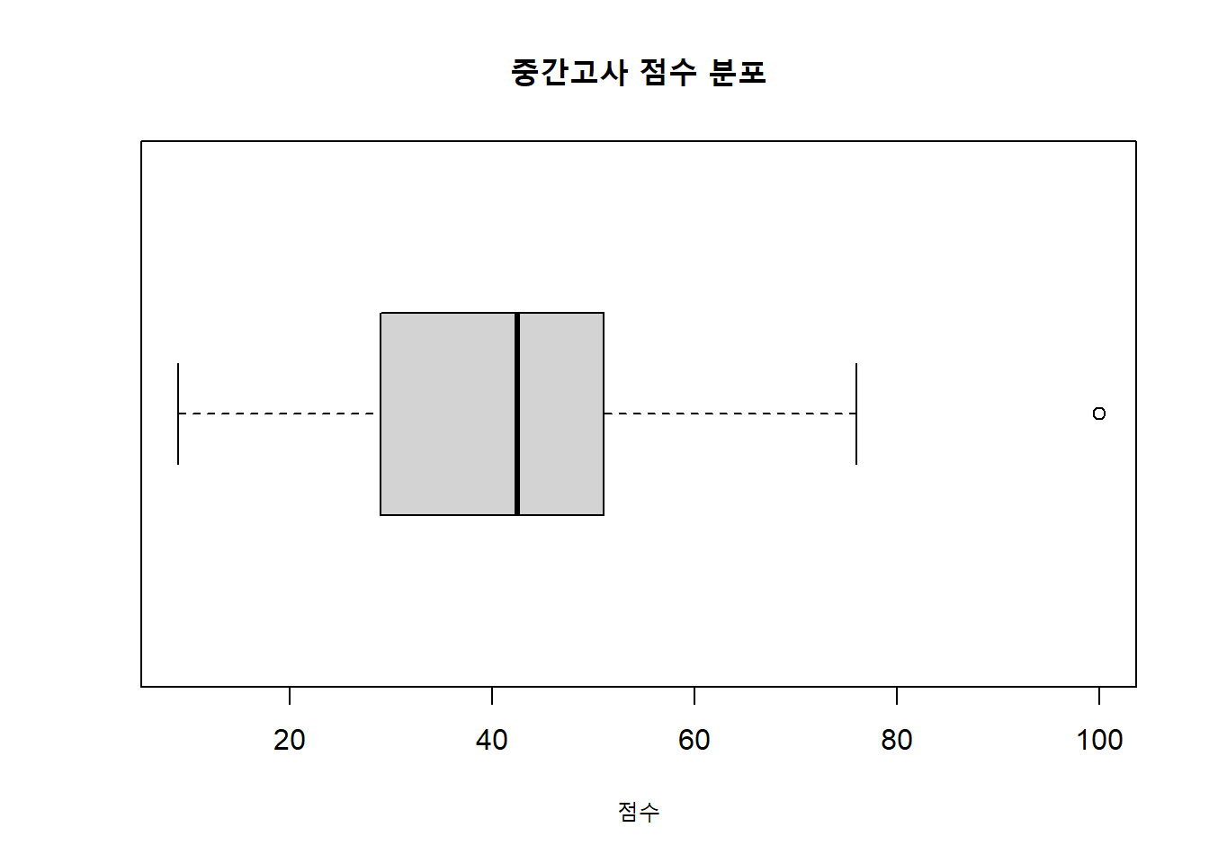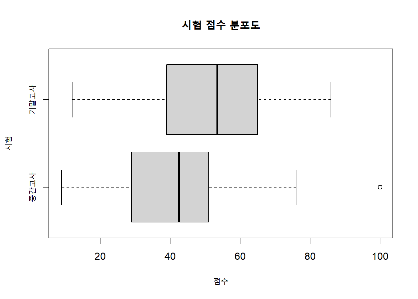 중간고사 점수 중 하나는 바꾸어 아웃라이어(outlier)를 만들어보도록 하자.