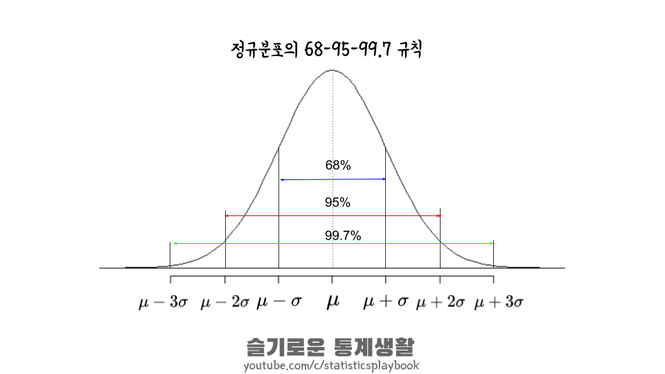 68-95-99.7 규칙은 모든 정규분포들이 따르는 규칙이라고 생각하면 쉽습니다. 단, 정확한 룰이 아니라 근사적으로 따른다는 것에 주의해야 합니다.