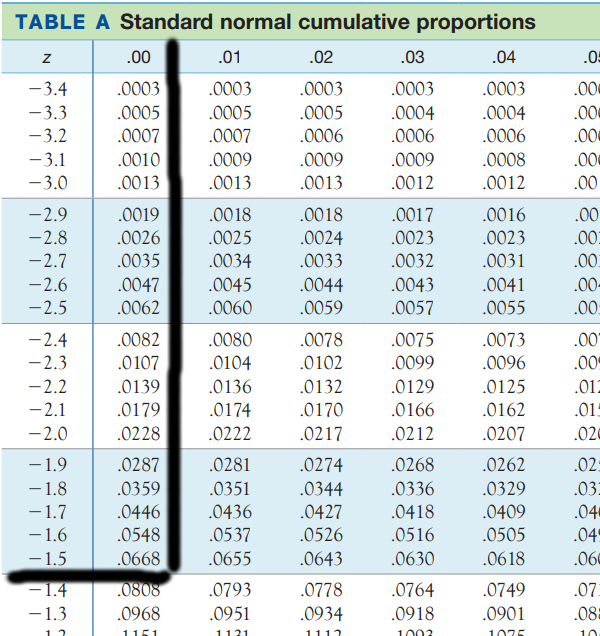 위의 꼴은 앞에서 살펴본 표준정규분포표에 계산되어 있는 꼴과 똑같은 꼴입니다. 따라서 첫번째 테이블에서 \(-1.5\)을 왼쪽행에서 찾고, 그 다음 \(0.00\)을 열에서 찾아봅시다.