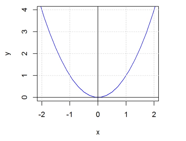 plot(x,y, xlim = c(-2,2), ylim = c(0,4), type = 'l', col = "Blue") abline(h = 0:4, v = -2:2, col = "Gray", lty=3) abline( v = 0, lty = 1) abline( h = 0, lty = 1)
